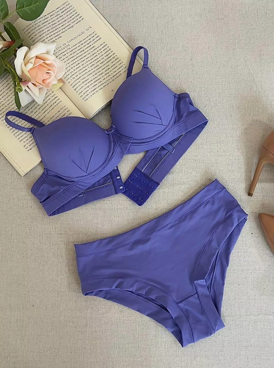 Modelo de conjunto em poliamida, com sutiã com bojo e com aro, bolha anatômica nos tamanhos P/M, sem bolha (bojo liso) nos tamanhos G/GG, colchetes triplos, com estrutura lateral mais alongada garantindo maior estabilidade, com alças reguláveis para facilitar na hora de vestir e a modelagem ao seu corpo.